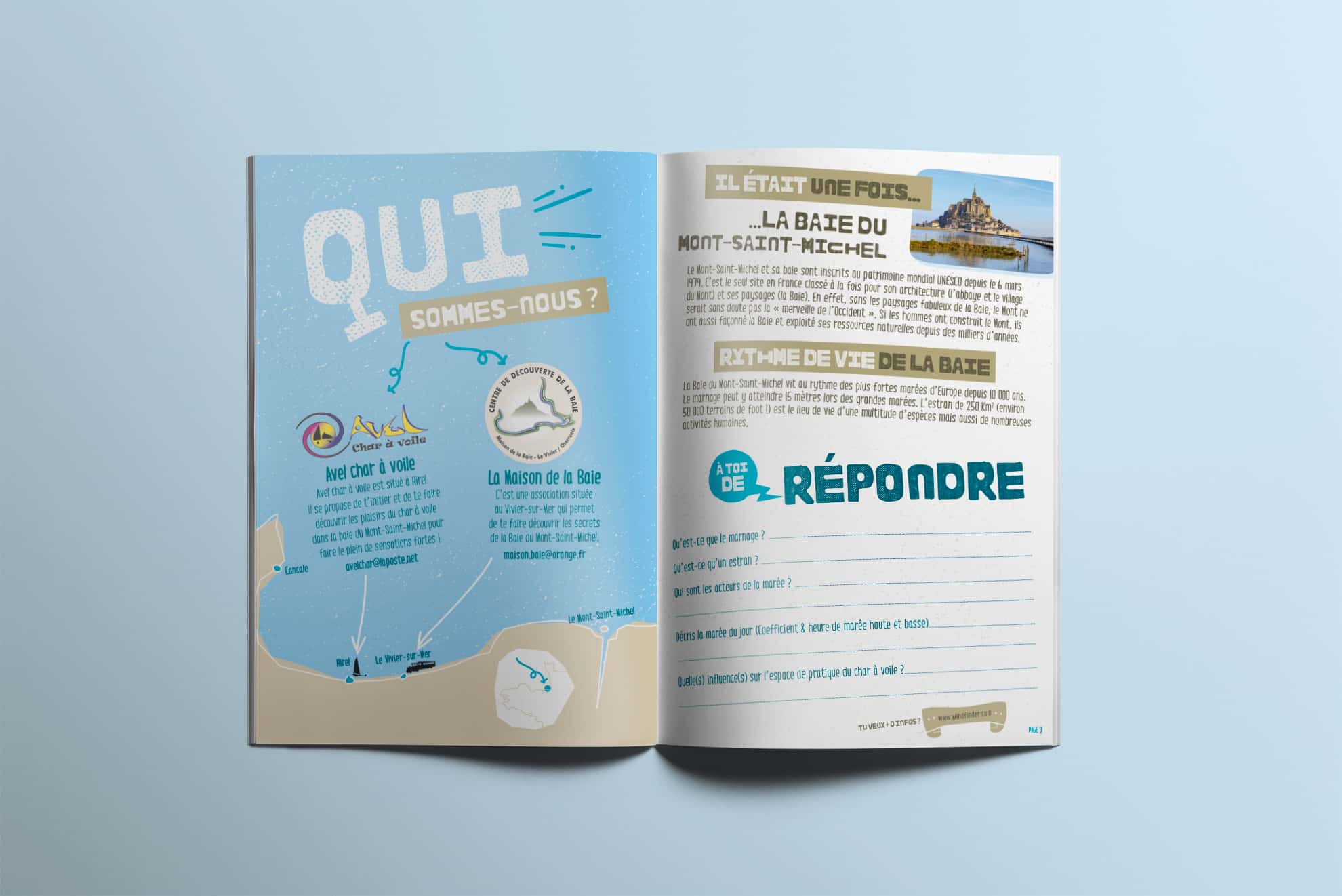 Avel Char à Voile et La Maison de la Baie proposent aux scolaires une sortie dans la Baie du Mont-Saint-Michel afin de leur faire découvrir cet espace unique et fragile. Pour les accompagner dans cette démarche ils m’ont demandé de réaliser un livret pédagogique.